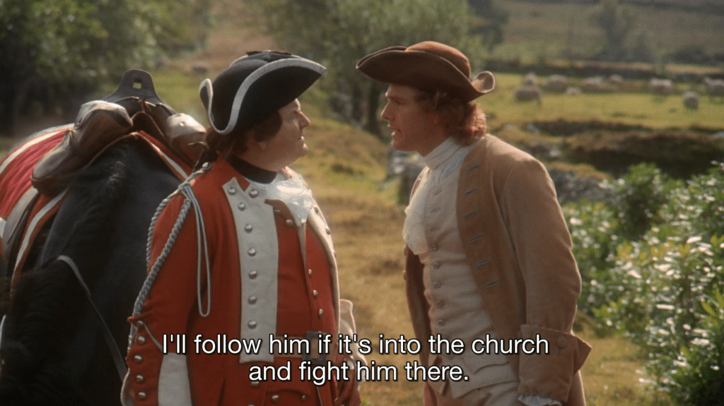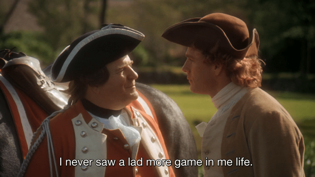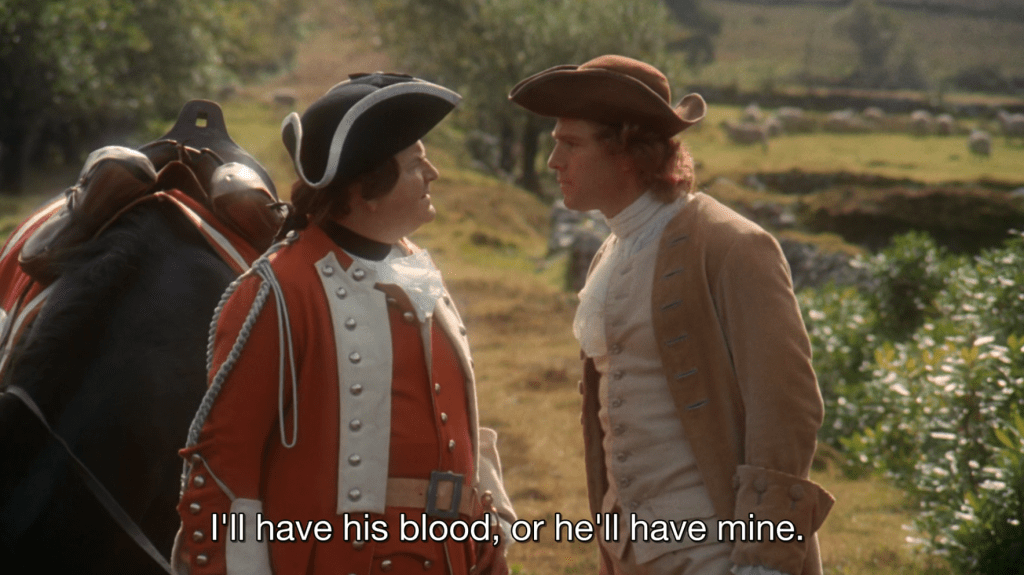 If speech is an action, an attempt to change the world through symbols—which only have efficacy through people, that is, which use people as a medium to effect transformations—then what is Barry after? I think, pretty simply, that he wants his desires to be taken seriously. His challenge, to Captain Quin, does not automatically result in a duel. Rather, the duel requires Quin taking it seriously, requires some degree of buy-in from other members of his immediate social circles, who will facilitate the duel—chiefly, buy-in from family members, from Grogan, from Quin himself. And that requires their taking Barry’s challenge—the passions of an adolescent—seriously. Not as fleeting whim, but as intractable resolution. He will not be persuaded, so they ought not even try; instead, they ought to move forward as quickly as possible with the duel, to reach a resolution.