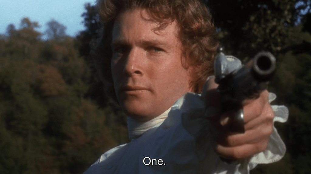 The bird-faced captain, meanwhile, is a mess; his hand quakes like an alcoholic. No doubt this fear helps inspire Barry’s calm—it is when others are most lost and panicked, that the wind, for some men, dies down, is replaced by quiet. And when, in the final duel of Barry Lyndon, when everything else reverses—when it is now an older, corrupt Barry who is challenged over a woman, challenged by his step-son, whose determination and sense of honor are like the young Barry’s own—it remains Barry who is unperturbable, while the step-son vomits in the corner of the barn, misfires his pistol.