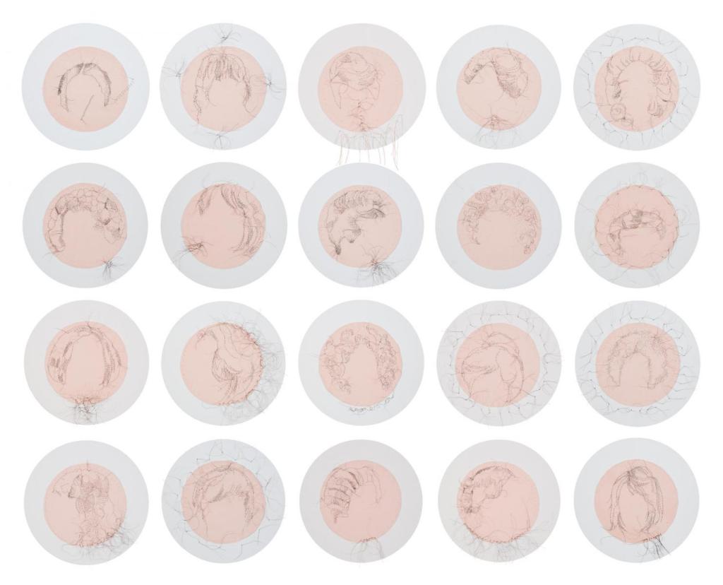 Rosemary Meza-Desplas since 2018 has been sewing “human hair drawings” with her own hair against flesh-pink fabric: