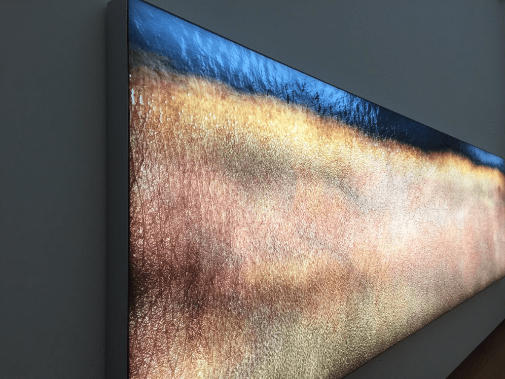 It only takes a moment of closer inspection to see that what look like video screens are actually light boxes covered with ultra-high-definition images printed on some sort of translucent material; it quickly becomes clear that the textures are not landscapes but extremely magnified portions of human skin. Miniscule wrinkles have been blown up into an intricate lattice of triangular intersections, concatenating across patchy fields of unevenly distributed melanin. The effect of this quasi-medical grotesque is reminiscent of the visit to Brobdingnag, the island of giants, in Jonathan Swift’s Gulliver’s Travels: witnessing a group of titanic maidens en déshabillé, the protagonist expresses not libertine delight but rather “horror and disgust,” since “their skins appeared so coarse and uneven, so variously colored, when I saw them near, with a mole here and there as broad as a trencher.”